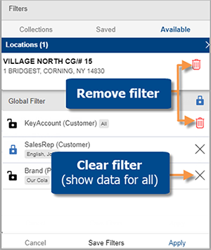To clear or remove a filter In the Filters panel, tap the X to clear a dimension or key filter (i.e., show data for all members). Tap the trash icon to completely remove a filter. Key and dimension filters must be cleared before you can remove them. Tip: You cannot remove a filter if it has a corresponding filter widget in the original dashboard. |