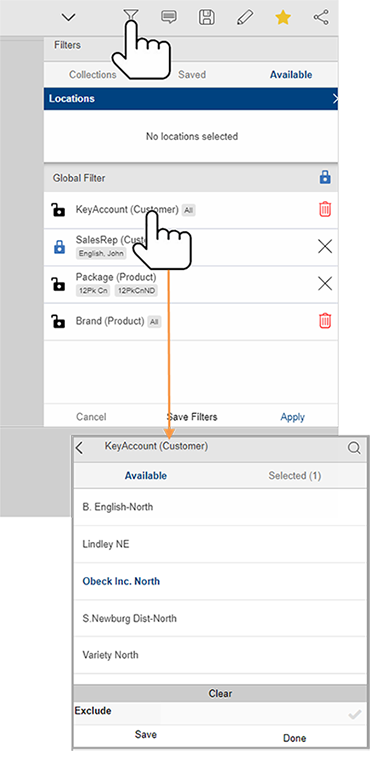 You can access this type of filter in the dashboard's Filters panel, which also shows any applicable global filters To edit a dashboard filter (e.g., select a different member) After opening the Filters panel, tap on any filter to edit it; then, choose one or more members to filter on them. Tap on Done and then Apply. To show data for all members (i.e., ignore the filter), leave it set to "All" in the filter panel. Tip: To filter out data for the selected member(s) rather than including data for those members, you can turn on the Exclude option at the bottom of the filter menu.