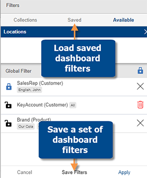 To add a dashboard filter In the Filters panel, go to the Collections area; then, apply or create a collection. |