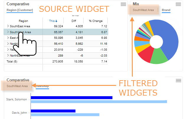 If widgets are linked, you can select a row or graph component in a "source" widget to filter other widgets in the dashboard. This filtering capability must be built into the dashboard.