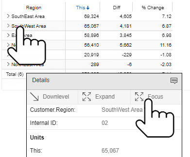In the source widget, tap on the row or bar of the member on which you want to filter. In the details window, tap on Focus.